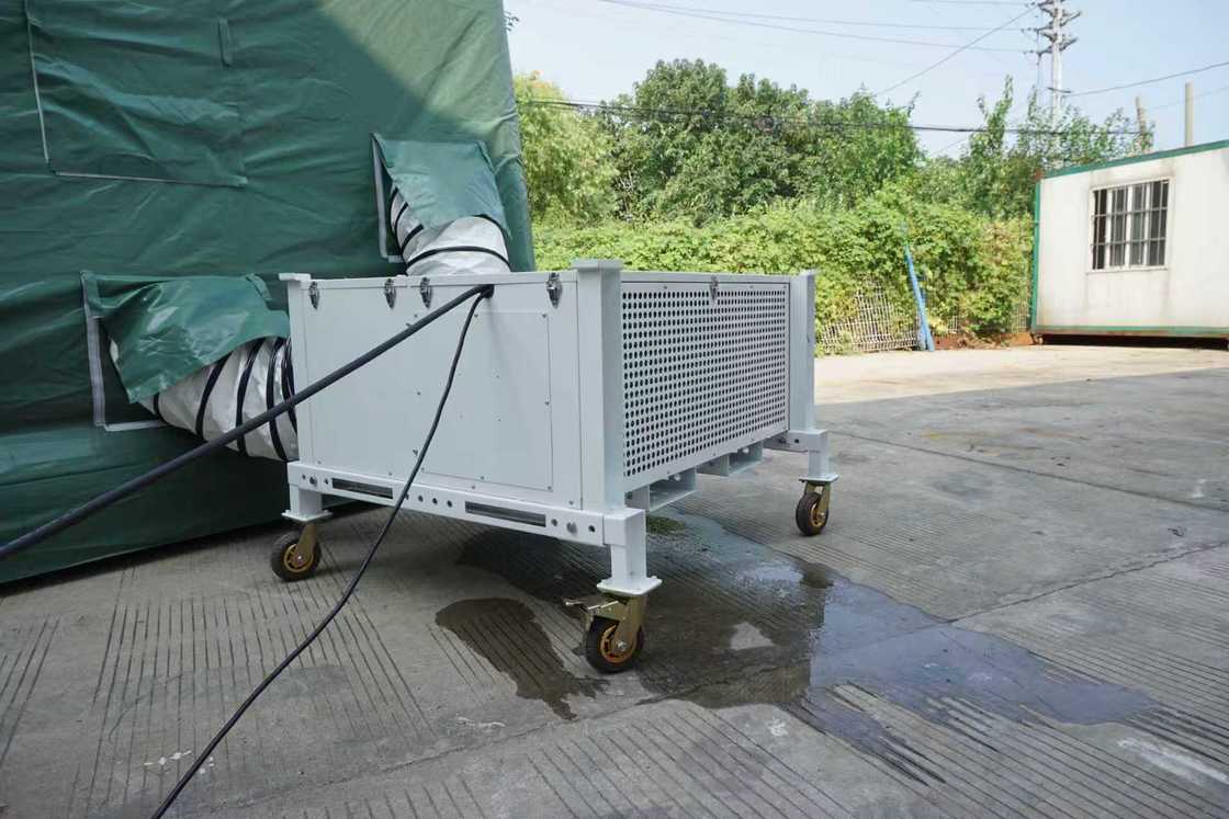 weather damage. The tent air conditioner is fitted with flexible duct and the unit itself must
